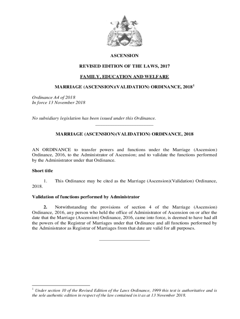 ASCENSION REVISED EDITION OF THE LAWS, 2017 FAMILY, EDUCATION AND WELFARE MARRIAGE (ASCENSION)(VALIDATION) ORDINANCE, 20181 Ordinance A4 of 2018 In force 13 November 2018No subsidiary legislation