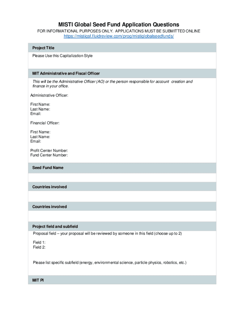 MIST Global Seed Fund Application Questions FOR INFORMATIONAL PURPOSES ONLY. APPLICATIONS MUST BE SUBMITTED ONLINEhttps://mistigsf.fluidreview.com/prog/mistiglobalseedfunds/ Project Title Please Use