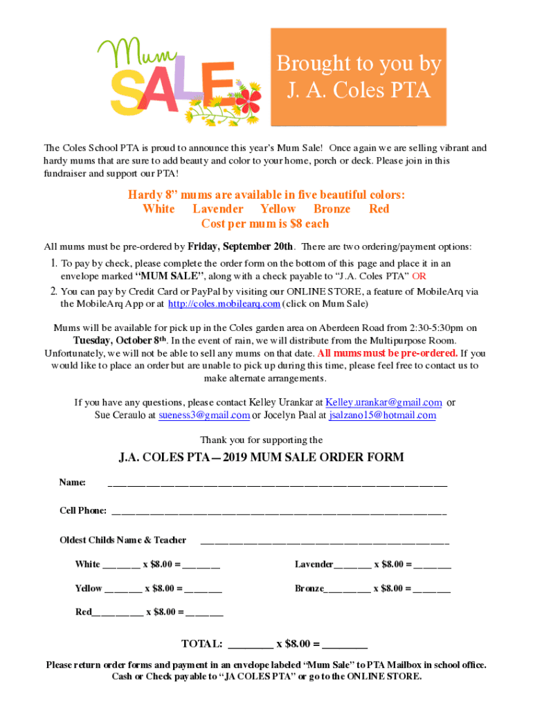 Brought to you by J. A. Cole's PTA The Cole's School PTA is proud to announce this year's Mum Sale! Once again we are selling vibrant and hardy sums that are sure to add beauty and color to your home,