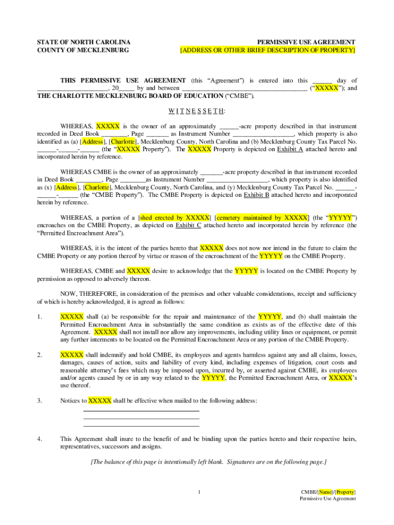 STATE OF NORTH CAROLINA COUNTY OF MECKLENBURGPERMISSIVE USE AGREEMENT [ADDRESS OR OTHER BRIEF DESCRIPTION OF PROPERTY]THIS PERMISSIVE USE AGREEMENT (this Agreement) is entered into this ___ day of