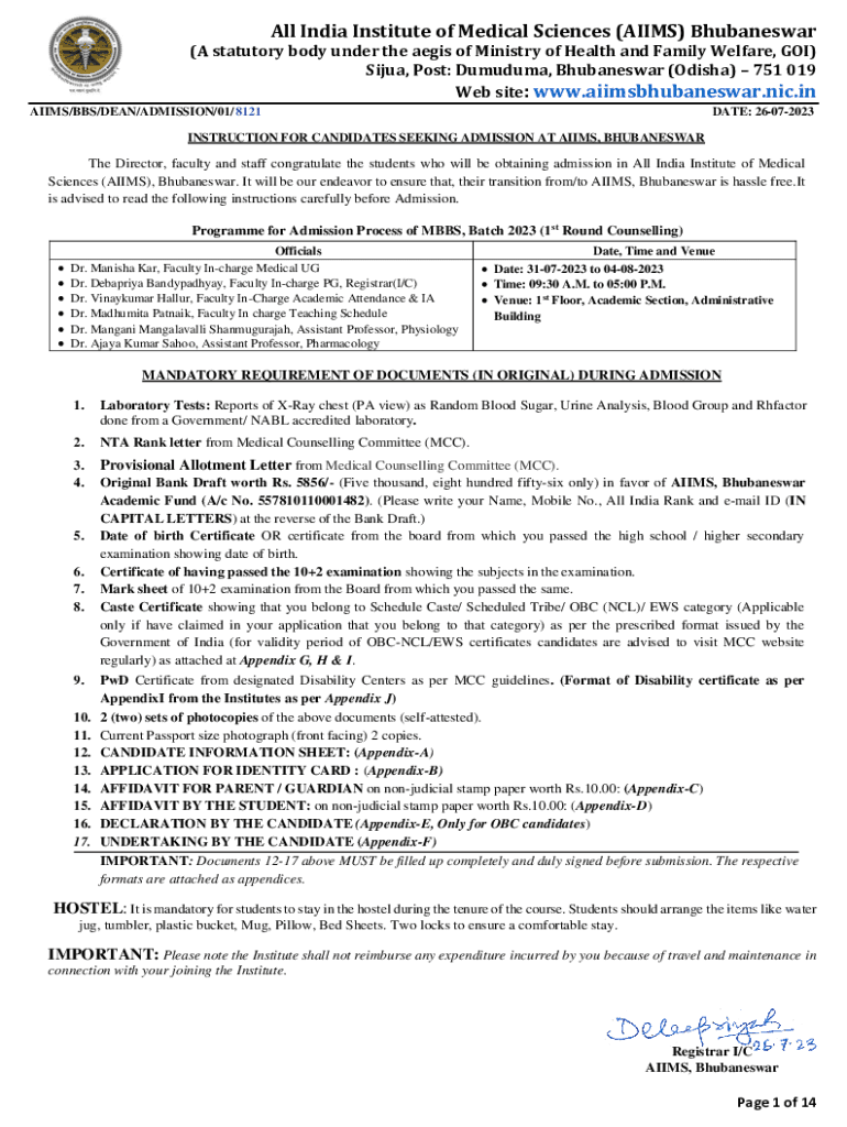 All India Institute of Medical Sciences (AIMS) Bhubaneswar (A statutory body under the aegis of Ministry of Health and Family Welfare, GOI) Silva, Post: Dumdum, Bhubaneswar (Odisha) 751 019 Website: