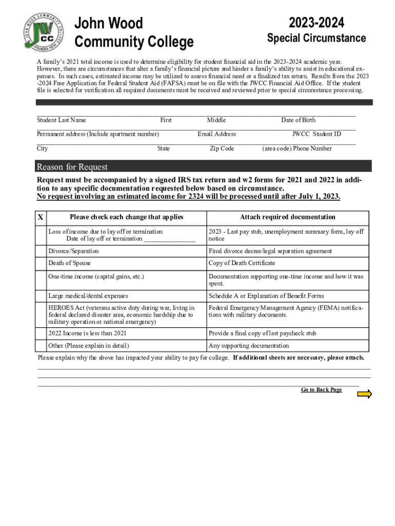 John Wood Community College20232024Special Circumstances families 2021 total income is used to determine eligibility for student financial aid in the 20232024 academic year. However, there are circumstances