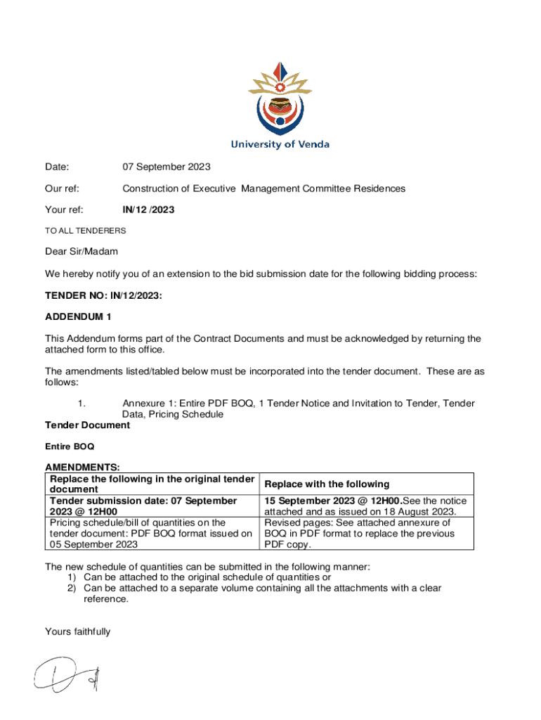 Date:07 September 2023Our ref:Construction of Executive Management Committee ResidencesYour ref:IN/12 /2023TO ALL TENDERERSDear Sir/Madam We hereby notify you of an extension to the bid submission