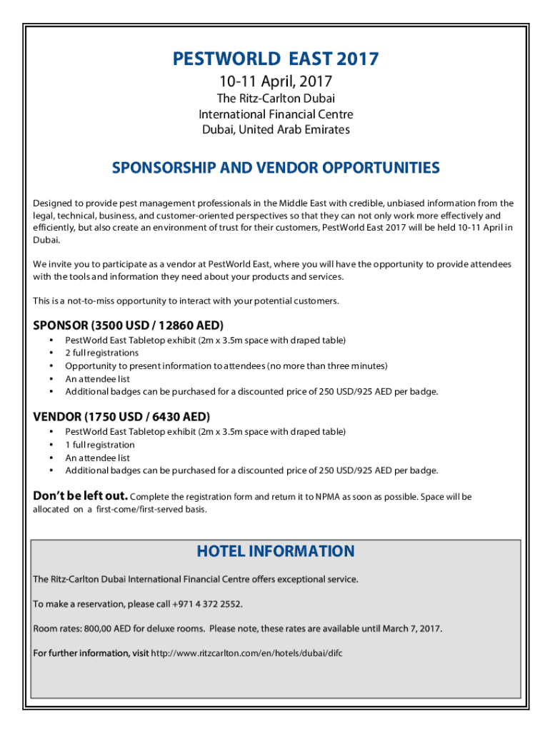 RESTORED EAST 2017 1011 April 2017 The Ritz Carlton Dubai International Financial Center Dubai, United Arab EmiratesSPONSORSHIP AND VENDOR OPPORTUNITIES Designed to provide pest management professionals