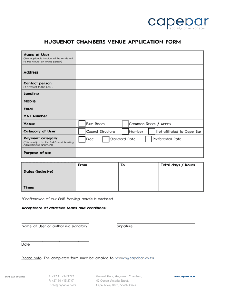 HUGUENOT CHAMBERS VENUE APPLICATION FORM Name of User (Any applicable invoice will be made out to this natural or juristic person)Address Contact person (If different to the User)Landline Mobile Email