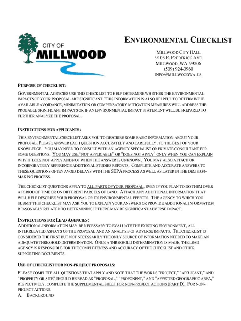 ENVIRONMENTAL CHECKLIST MILLPOND CITY HALL 9103 E. FREDERICK AVE MILLPOND, WA 99206 (509) 9240960 INFO@MILLWOODWA.US PURPOSE OF CHECKLIST: GOVERNMENTAL AGENCIES USE THIS CHECKLIST TO HELP DETERMINE