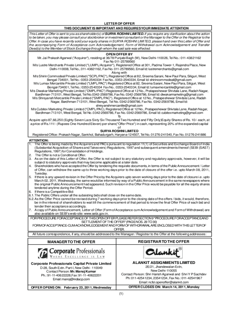 LETTER OF OFFER THIS DOCUMENT IS IMPORTANT AND REQUIRES YOUR IMMEDIATE ATTENTION This Letter of Offer is sent to you as shareholder(s) of SURYA ROSSINI LIMITED. If you require any clarification about