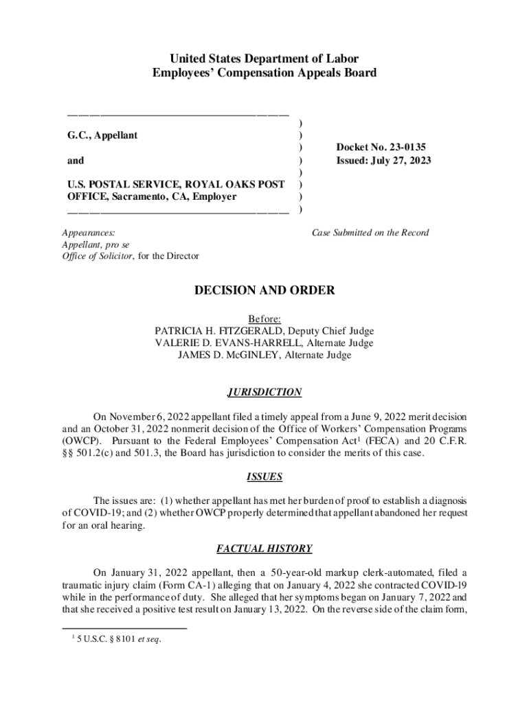 United States Department of Labor Employees Compensation Appeals Board ___) G.C., Appellant) ) and) ) U.S. POSTAL SERVICE, ROYAL OAKS POST) OFFICE, Sacramento, CA, Employer) ___) Appearances: Appellant,