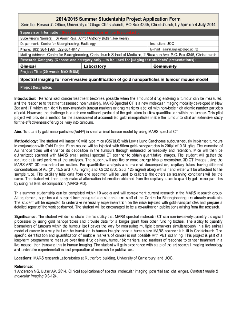 2014/2015 Summer Studentship Project Application Form Send to: Research Office, University of Stage Christchurch, PO Box 4345, Christchurch, by 5pm on 4 July 2014 Supervisor Information (First named