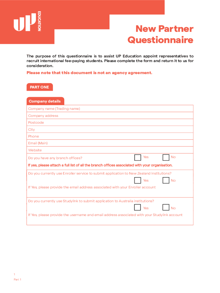 New Partner Questionnaire The purpose of this questionnaire is to assist UP Education appoint representatives to recruit international fee paying students. Please complete the form and return it to
