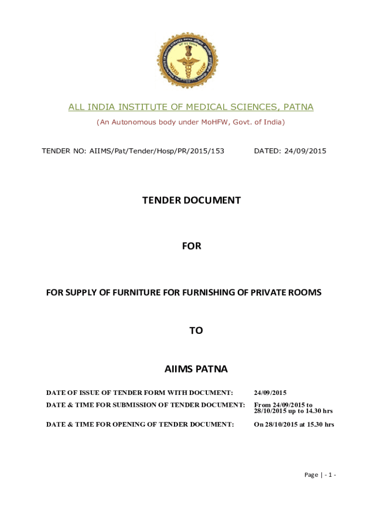 ALL INDIA INSTITUTE OF MEDICAL SCIENCES, PATNA (An Autonomous body under Mohawk, Govt. of India)TENDER NO: AIMS/Pat/Tender/Hosp/PR/2015/153DATED: 24/09/2015TENDER DOCUMENTFORFOR SUPPLY OF FURNITURE