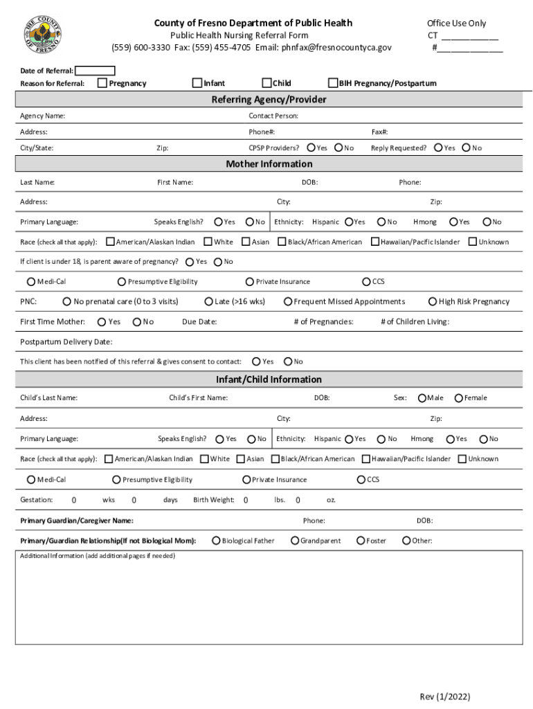 County of Fresno Department of Public HealthOffice Use Only CT ___ #___Public Health Nursing Referral Form (559) 6003330 Fax: (559) 4554705 Email: phnfax@fresnocountyca.gov Date of Referral: Reason