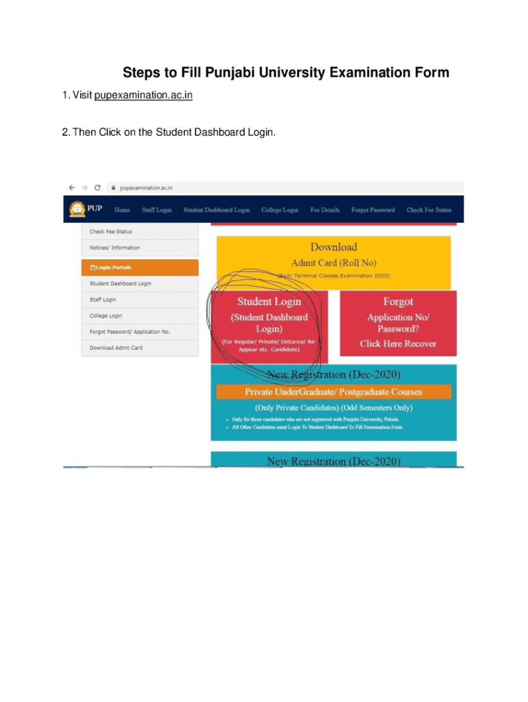 Steps to Fill Punjabi University Examination Form 1. Visit pup examination.ac.in2. Then Click on the Student Dashboard Login.3. After that you have to fill your University ID and Password received