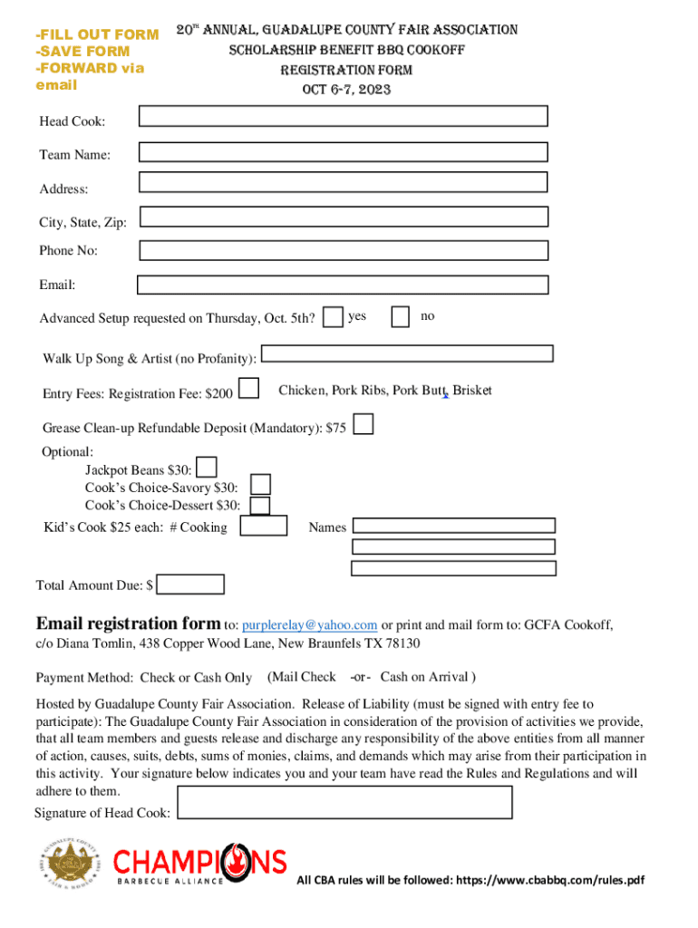 FILL OUT FORM SAVE FORM FORWARD via email20th Annual, Guadalupe County FAIR ASSOCIATION Scholarship Benefit BBQ COOKOUT REGISTRATION FORM Oct 67, 2023Head Cook: Team Name: Address: City, State, Zip: