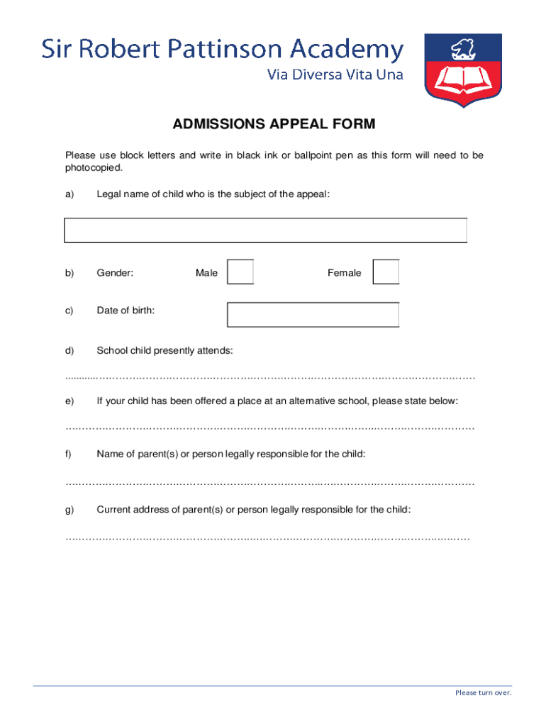 ADMISSIONS APPEAL FORM Please use block letters and write in black ink or ballpoint pen as this form will need to be photocopied. a)Legal name of child who is the subject of the appeal:b)Gender:c)Date