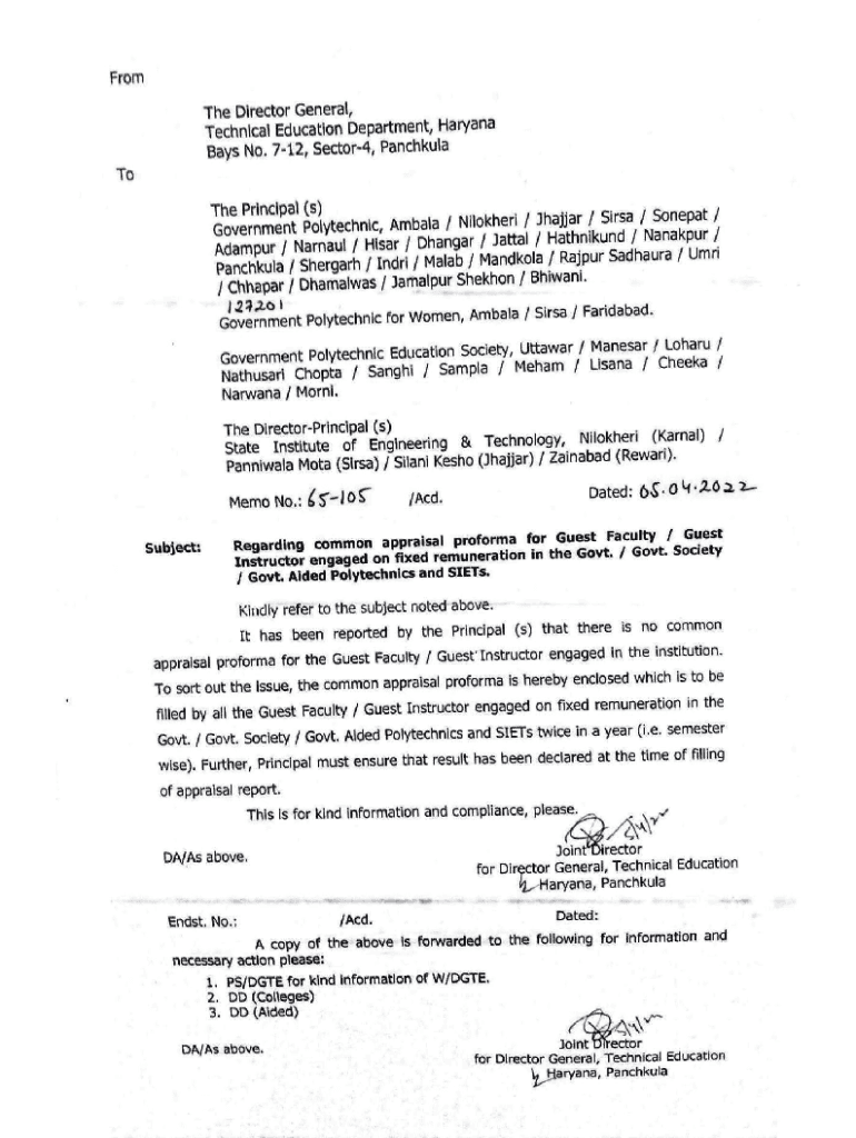 TECHNICAL EDUCATION DEPARTMENT HARYANA ANNUAL APPRAISAL REPORT (To be completed and submitted at the end of each semester of academic year. Semester wise performance based assessment will be for (i)