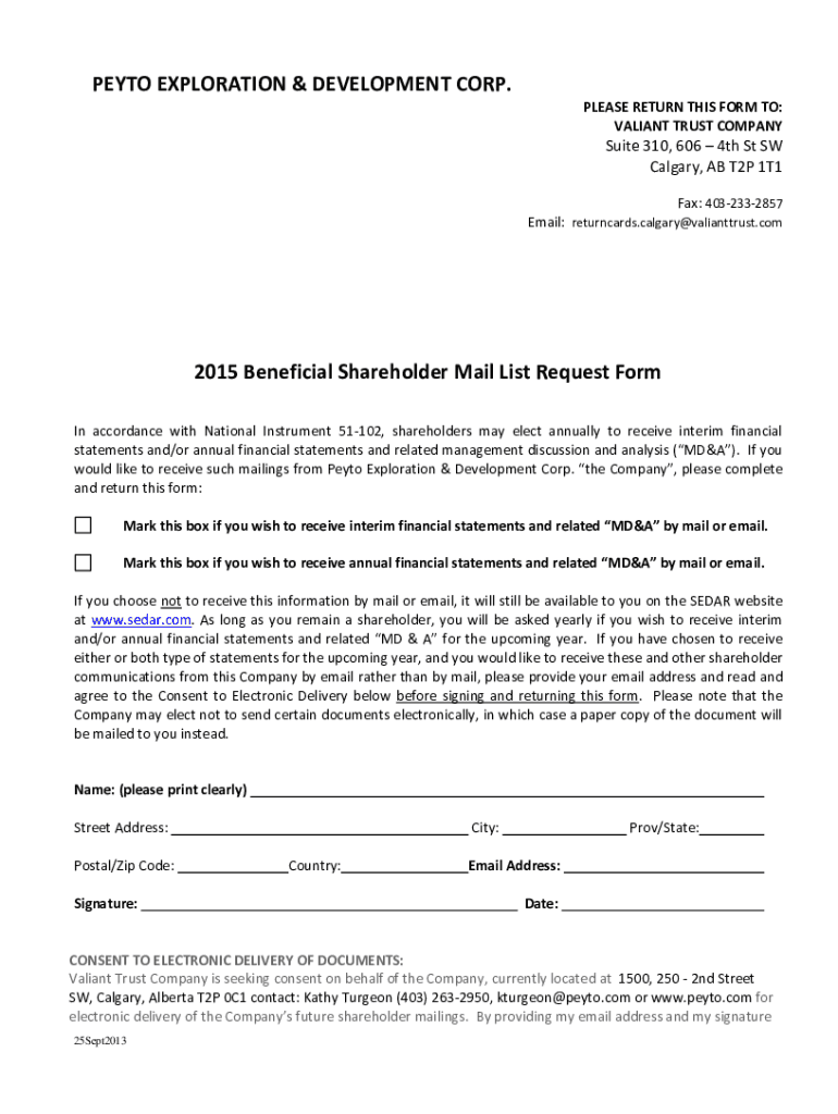 PESTO EXPLORATION & DEVELOPMENT CORP. PLEASE RETURN THIS FORM TO: VALIANT TRUST Company-wide 310, 606 4th St SW Calgary, AB T2P 1T1 Fax: 4032332857 Email: return cards.calgary@valianttrust.com2015