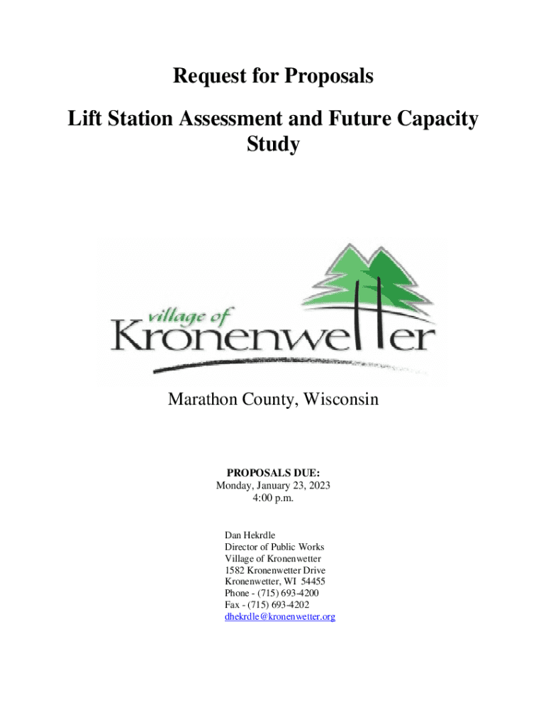 Request for Proposals Lift Station Assessment and Future Capacity Study Marathon County, WisconsinPROPOSALS DUE: Monday, January 23, 2023 4:00 p.m. Dan Hurdle Director of Public Works Village of Kronenwetter