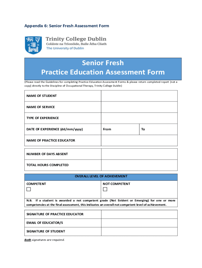 Appendix 6: Senior Fresh Assessment Form Senior Fresh Practice Education Assessment Form (Please read the Guidelines for completing Practice Education Assessment Forms & please return completed report