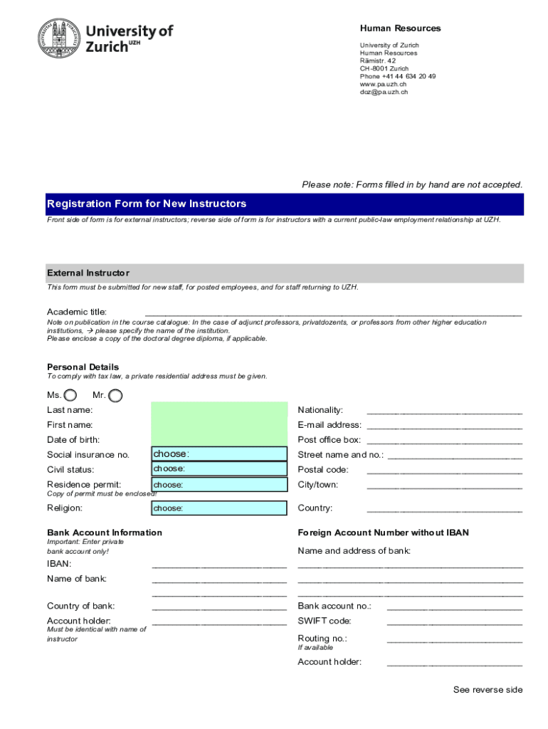 Human Resources University of Zurich Human Resources Mister. 42 CH8001 Zurich Phone +41 44 634 20 49 www.pa.uzh.ch doz@pa.uzh.chPlease note: Forms filled in by hand are not accepted. Registration