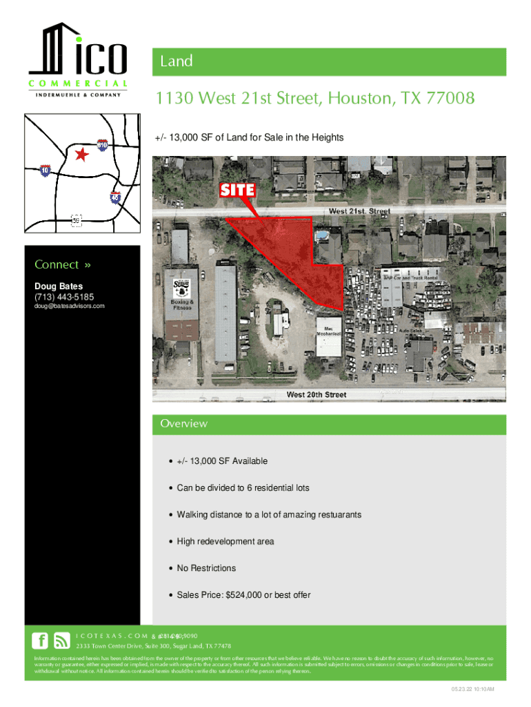 Land1130 West 21st Street, Houston, TX 77008 +/ 13,000 SF of Land for Sale in the HeightsConnect Doug Bates (713) 4435185 doug@batesadvisors.comOverview +/ 13,000 SF Available Can be divided to 6