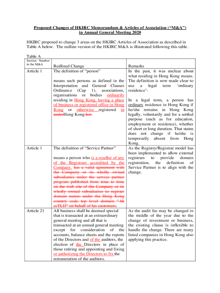 Proposed Changes of HK IRC Memorandum & Articles of Association (M&A) in Annual General Meeting 2020 HK IRC proposed to change 3 areas on the HK IRC Articles of Association as described in Table A