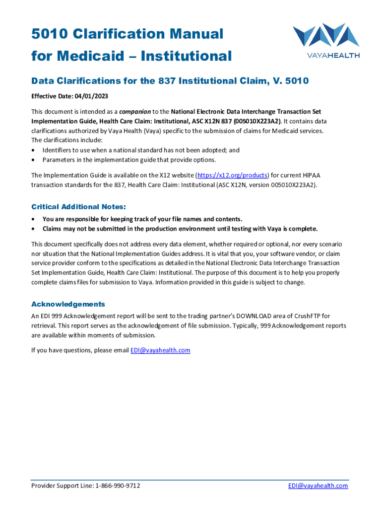 5010 Clarification Manual for Medicaid Institutional Data Clarifications for the 837 Institutional Claim, V. 5010 Effective Date: 04/01/2023 This document is intended as a companion to the National