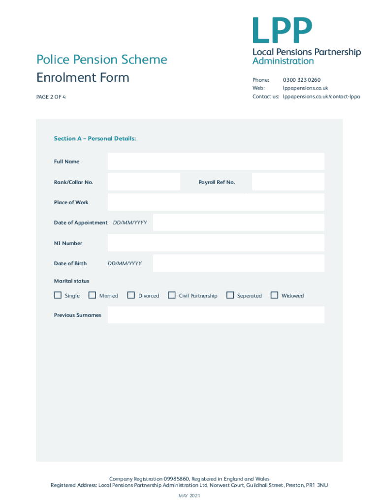 Police Pension Scheme Enrollment Hormone:0300 323 0260Web:lppapensions.co.contact us: lppapensions.co.uk/contactlppaPAGE 1 OF 4Notes for Guidance By completing this form, you are electing to join