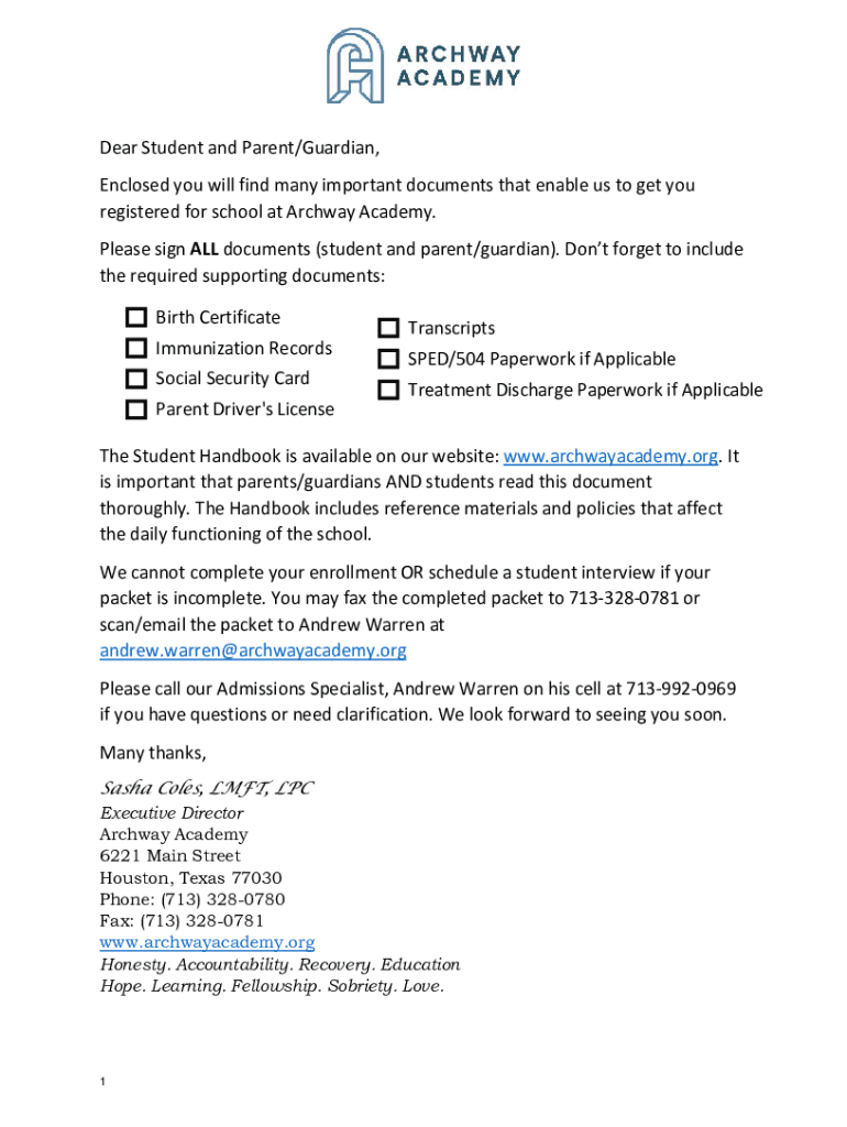 Dear Student and Parent/Guardian, Enclosed you will find many important documents that enable us to get you registered for school at Archway Academy. Please sign ALL documents (student and parent/guardian).