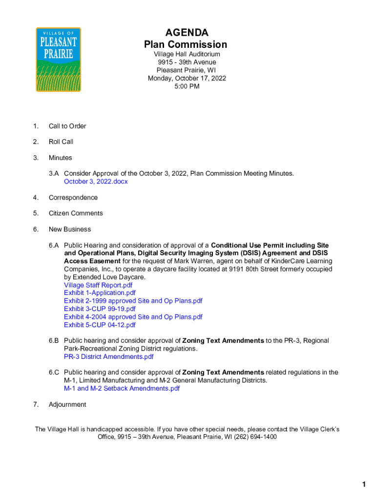 AGENDA Plan Commission Village Hall Auditorium 9915 39th Avenue Pleasant Prairie, WI Monday, October 17, 2022 5:00 PM1. Call to Order2. Roll Call3. Minutes 3. A Consider Approval of the October 3,