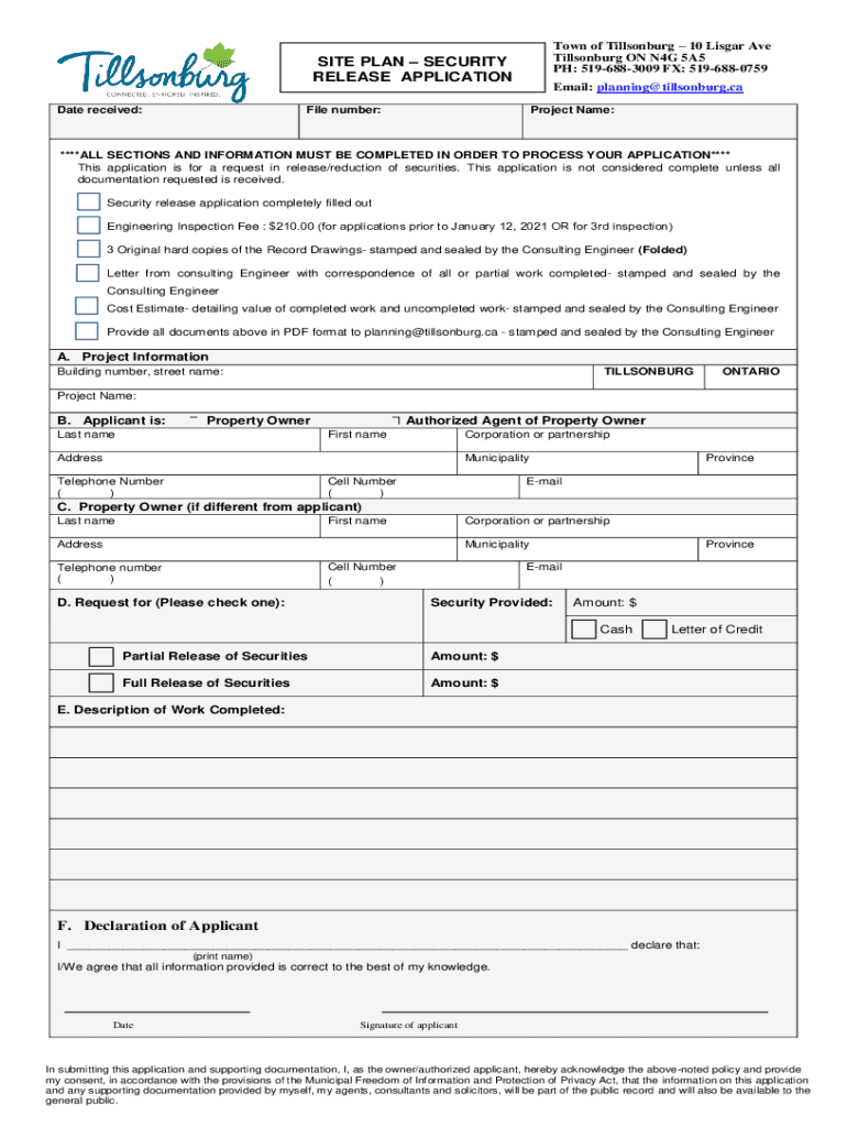Town of Tillsonburg 10 Linear Ave Tillsonburg ON N4G 5A5 PH: 5196883009 FX: 5196880759SITE PLAN SECURITY RELEASE APPLICATION Date received:Email: planning@tillsonburg.caFile number:Project Name:****ALL