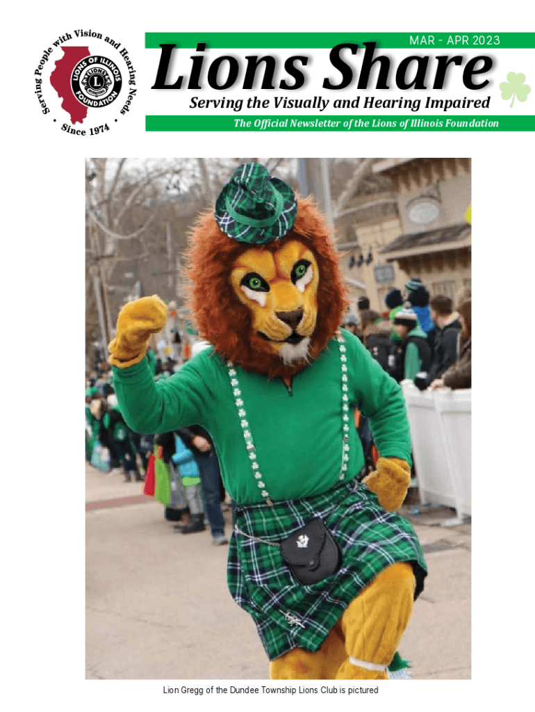 Lions Share MAR APR 2023Serving the Visually and Hearing Impaired Official Newsletter of the Lions of Illinois FoundationLion Gregg of the Dundee Township Lions Club is picturedInside this Issue Page