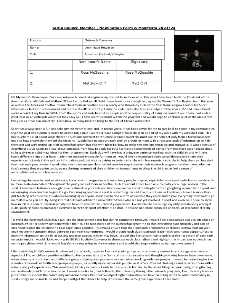 USA Council Member Nomination Form & Manifesto 2023/24Position:Outreach ConvenorName:Dominique HewitsonClub:American Football/Volleyball Nominators NameSignature1. Ross McGeachieRoss McGeachie2. Matthew