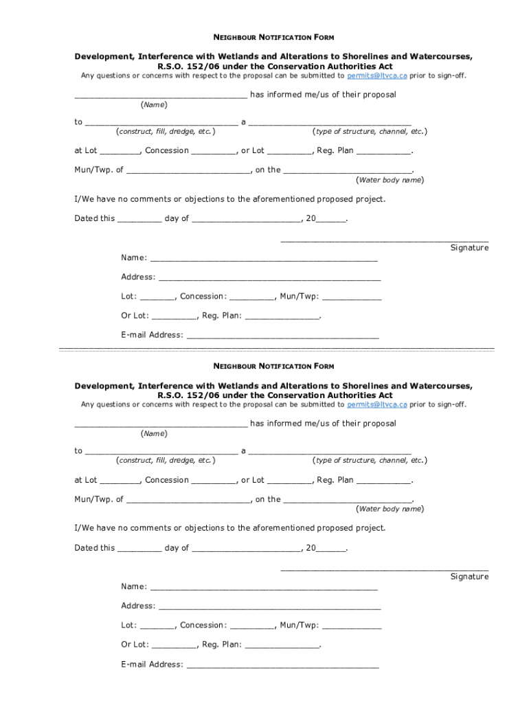Neighbor NOTIFICATION FORM Development, Interference with Wetlands and Alterations to Shorelines and Watercourses, R.S.O. 152/06 under the Conservation Authorities Act Any questions or concerns with