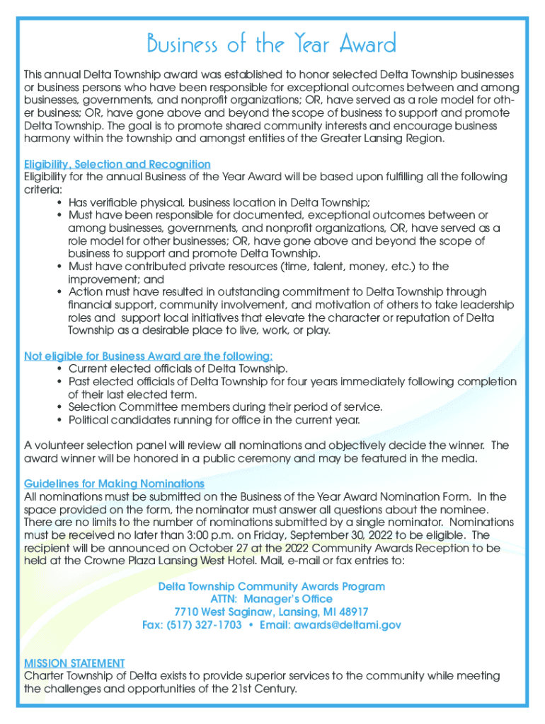 Business of the Year Award This annual Delta Township award was established to honor selected Delta Township businesses or business persons who have been responsible for exceptional outcomes between