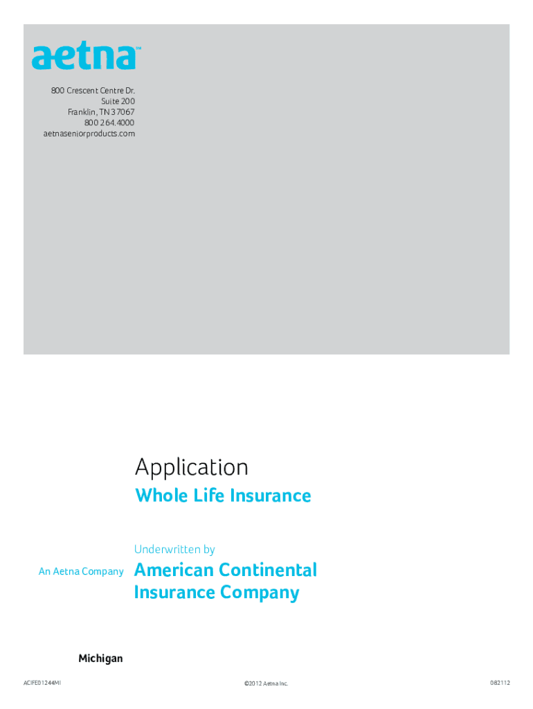 800 Crescent Center Dr. Suite 200 Franklin, TN 37067 800 264.4000 aetnaseniorproducts.complication Whole Life Insurance Underwritten by An Aetna Company American Continental Insurance Company Michigan