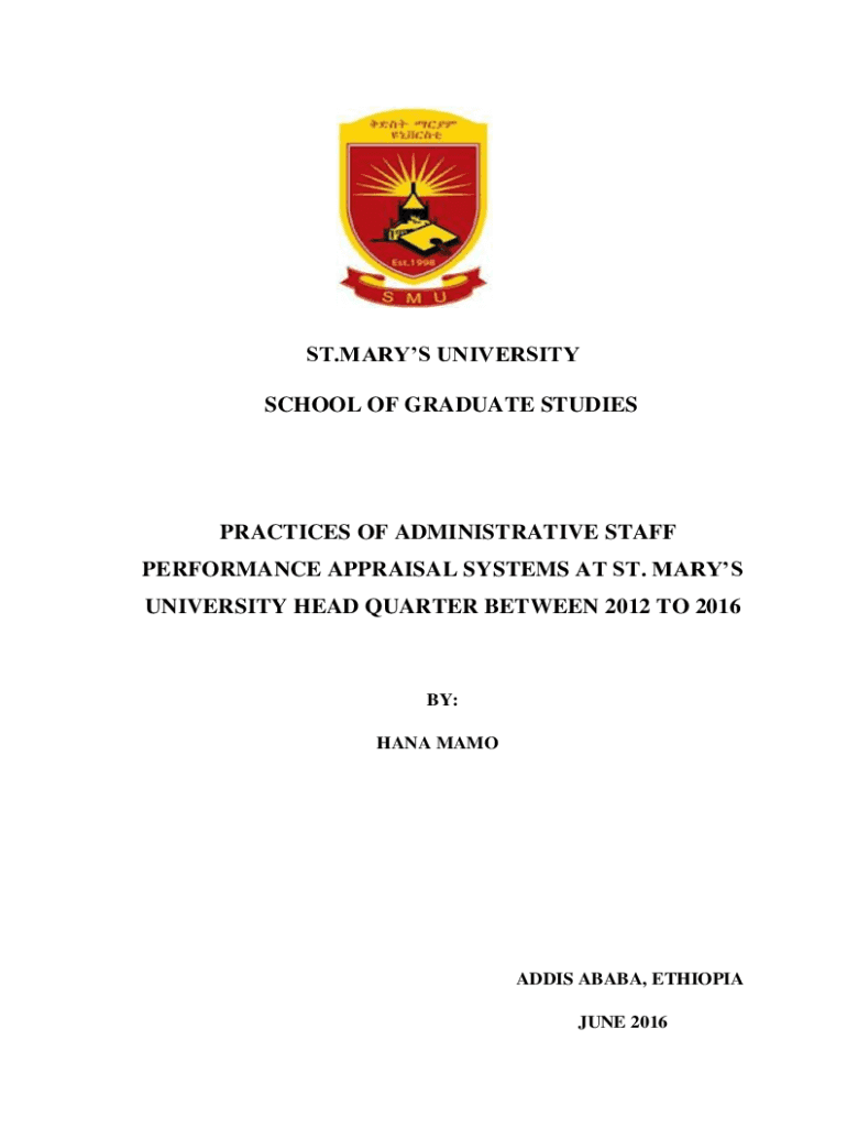 ST.MARY UNIVERSITY SCHOOL OF GRADUATE STUDIESPRACTICES OF ADMINISTRATIVE STAFF PERFORMANCE APPRAISAL SYSTEMS AT ST. MARY UNIVERSITY Headquarter BETWEEN 2012 TO 2016BY: HAND MAMOADDIS AB ABA, ETHIOPIA