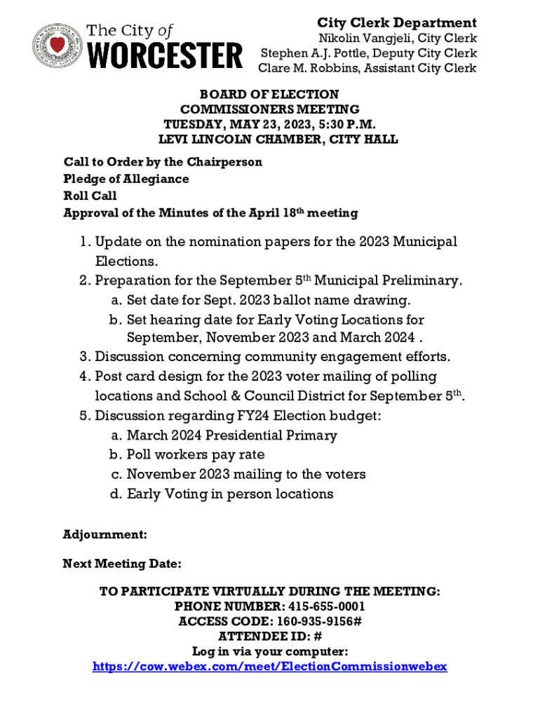 City Clerk DepartmentNikolin Angel, City Clerk Stephen A.J. Bottle, Deputy City Clerk Clare M. Robbins, Assistant City Clerk BOARD OF ELECTION COMMISSIONERS MEETING TUESDAY, MAY 23, 2023, 5:30 P.M.