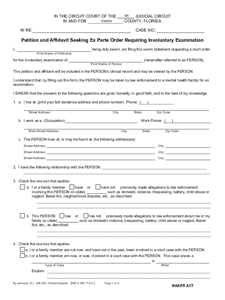 IN THE CIRCUIT COURT OF THE Osceola IN AND NONJUDICIAL CIRCUIT COUNTY, FLORIDA 9thIN RE:CASE NO.:Petition and Affidavit Seeking Ex Parte Order Requiring Involuntary Examination I, Print Name of Petitioner