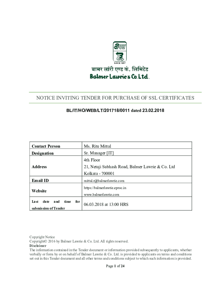 NOTICE INVITING TENDER FOR PURCHASE OF SSL CERTIFICATES BL/IT/HO/WEB/LT/201718/0011 dated 23.02.2018Contact Persons. Rite MittalDesignationSr. Manager [IT]Address4th Floor 21, Nepali Subhash Road,