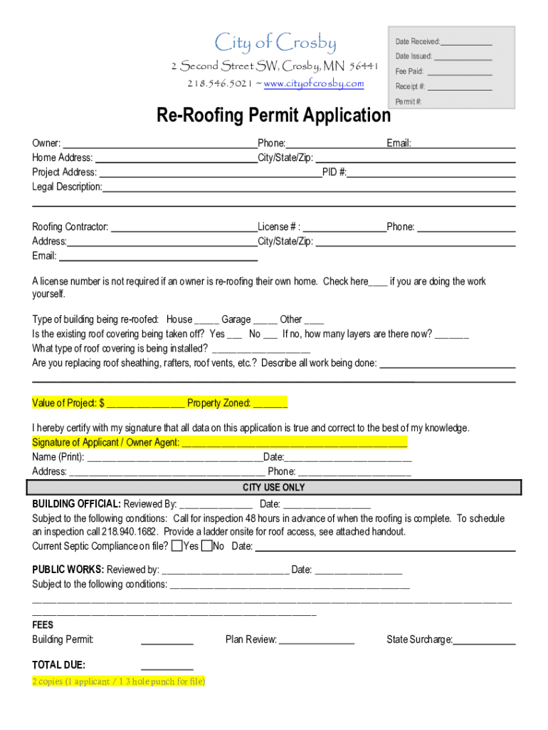 City of CrosbyDate Received: Date Issued:2 Second Street SW, Crosby, MN 56441Fee Paid:218.546.5021 www.cityofcrosby.comReceipt #:Reproofing Permit Application Owner: Home Address: Project Address: