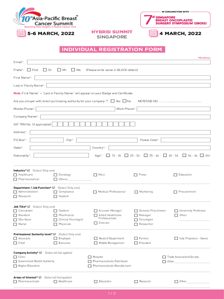 HYBRID SUMMIT SINGAPORE56 MARCH 20224 MARCH, 2022INDIVIDUAL REGISTRATION FORM *MandatoryEmail*:Prefix*:Prof. Dr. Mr. Ms. (Please write name in BLOCK letters)First Name*:Last or Family Name*:Note: