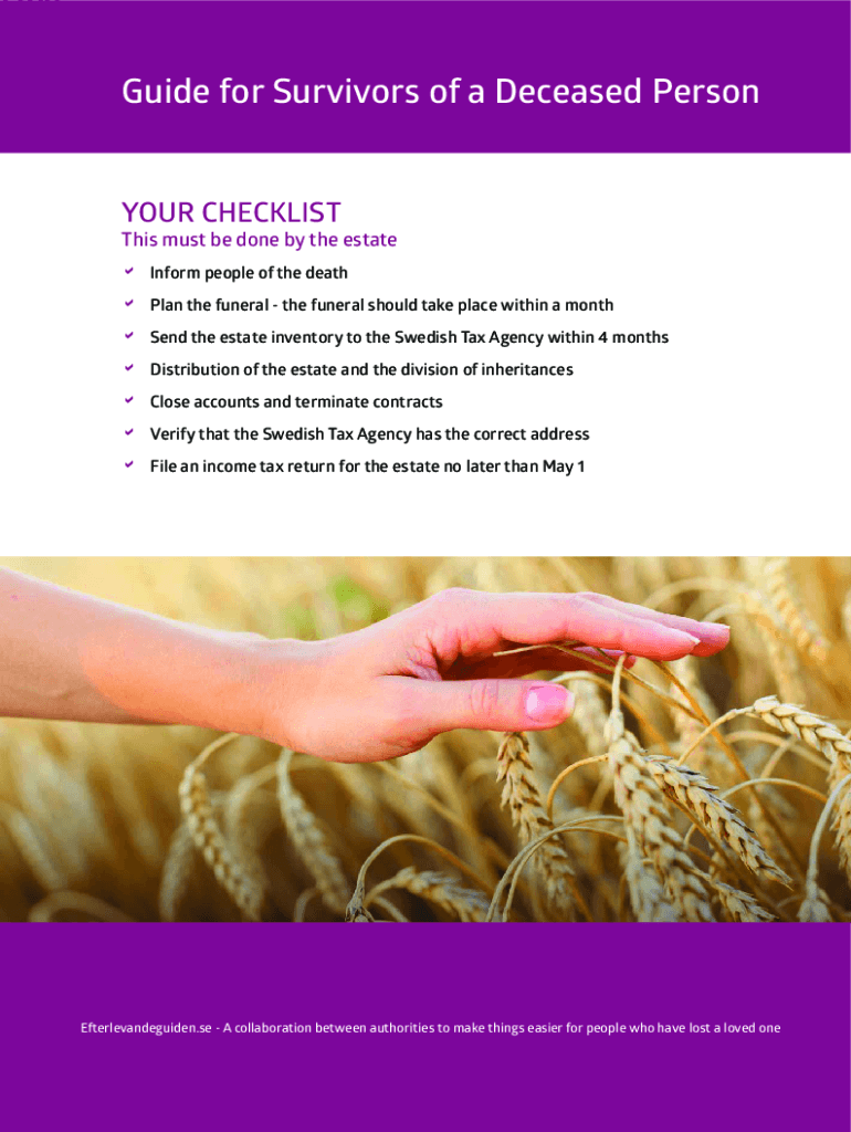 Disguise for Survivors of a Deceased Person YOUR Checklists must be done by the estate an Inform people of the death a Plan the funeral should take place within a month a Sand the estate inventory