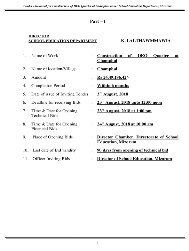 Tender Document for Construction of DO Quarter at Champlain under School Education Department, Mizoram. Part I DIRECTOR SCHOOL EDUCATION DEPARTMENT. LALTHAWMMAWIA1. Name of Work:Construction Champhai2.