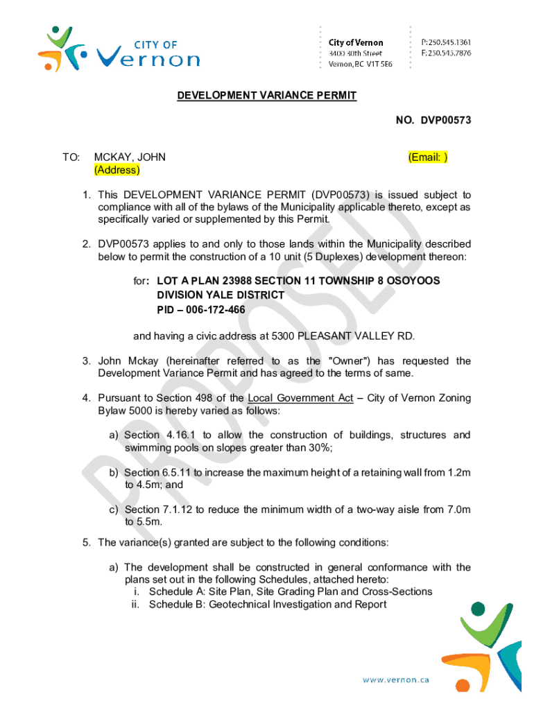 DEVELOPMENT VARIANCE PERMIT NO. DVP00573 TO:McKay, JOHN (Address)(Email:)1. This DEVELOPMENT VARIANCE PERMIT (DVP00573) is issued subject to compliance with all the bylaws of the Municipality applicable