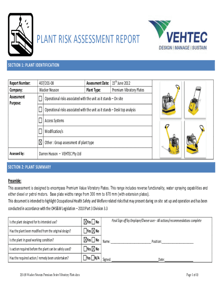 PLANT RISK ASSESSMENT REPORT SECTION 1: PLANT IDENTIFICATION Report Number: Company: Assessment Purpose:407/20108 Wacker NeusonAssessment Date: 15th June 2012 Plant Type: Premium Vibratory PlatesOperational