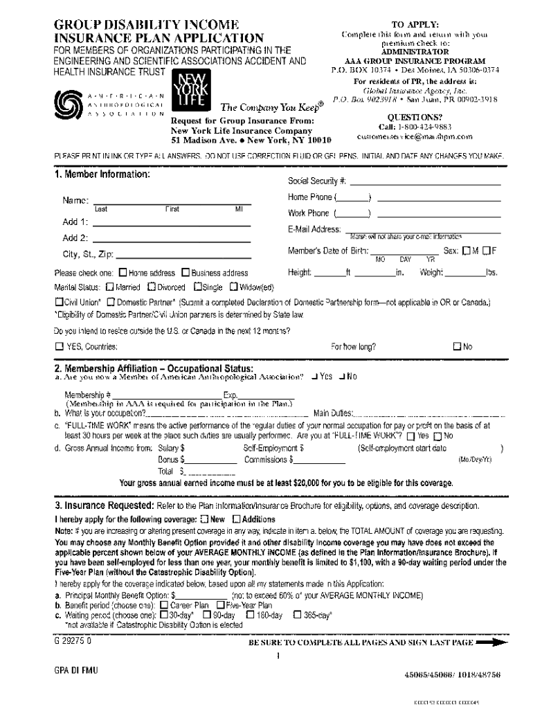 TO APPLY:Complete this form and return with your premium check to: ADMINISTRATOR AAA GROUP INSURANCE PROGRAM P.O. BOX 10374 Des Moines, IA 503060374 For residents of PR, the address is: Global Insurance