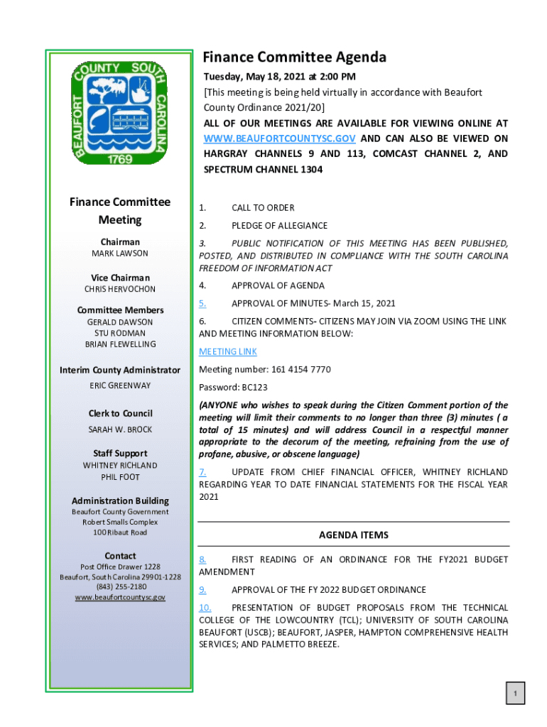 Finance Committee Agenda Tuesday, May 18, 2021, at 2:00 PM [This meeting is being held virtually in accordance with Beaufort County Ordinance 2021/20] ALL OF OUR MEETINGS ARE AVAILABLE FOR VIEWING
