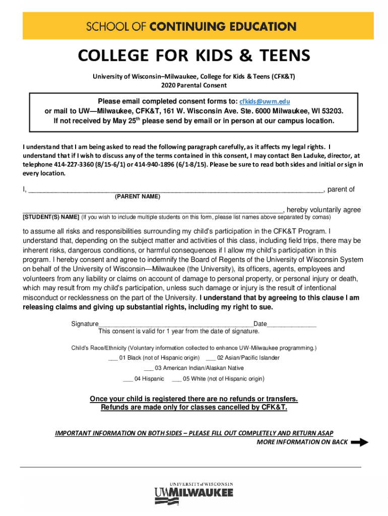 COLLEGE FOR KIDS & TEENS University of Wisconsin Milwaukee, College for Kids & Teens (CFT) 2020 Parental Consent Please email completed consent forms to: cfkids@uwm.edu or mail to Milwaukee, CFT,