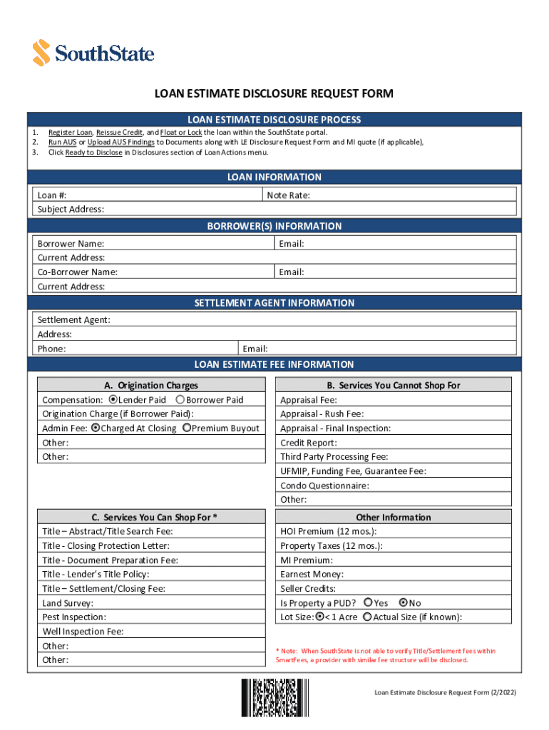 LOAN ESTIMATE DISCLOSURE REQUEST FORM 1. 2. 3.LOAN ESTIMATE DISCLOSURE PROCESSRegister Loan, Reissue Credit, and Float or Lock the loan within the Southgate portal. Run AUS or Upload AUS Findings